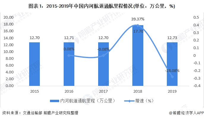 2015-2019年我国内河航道通航里程总体波动较小,2018年通航里程达到近5年最高值,2019年我国内河航道通航里程为12.73万公里,同比下降28.08%,较2018年大幅回落。
