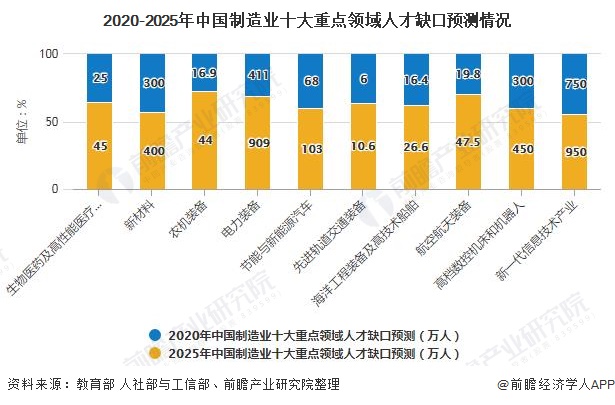 从人才的需求端看,随着中国人口红利优势的淡化,人才缺口逐渐显现,应用型与创研型人才尤其缺乏。中国是传统的制造业大国,如果以制造业为例,对标人才市场的供求关系:2020-2025年,中国在新一代信息技术、电力装备、新材料等领域人才缺口巨大,这意味着人才紧缺的现实将越来越严峻。