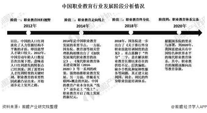 自2012年以来,国务院、教育部、人社部等相关部门已连续出台了一系列政策措施,利用校企合作、互联网+、终身教育等多理念多方式结合的方法,不断探索和推进职教体系的完备,应对国家发展对劳动力资源的新要求,为国家战略落地提供人才支撑。目前,我国职业教育逐步走向线上化、终身化,职业教育体系逐渐完备。