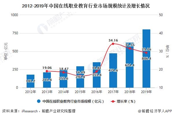 2012-2019年,我国职业在线教育市场规模增长迅速,从181.2亿元达到806.4亿元,年复合增长率达23.77%。