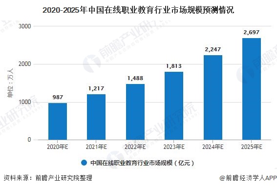 由此可见,推动在线职业教育发展意义重大。除此之外,我国在线职业教育潜在用户群体覆盖广泛且基数庞大,每年新增用户群体数十分稳健。未来,中国职业在线教育市场发展空间将继续上升,预计2025年市场规模将达到2697亿元左右。
