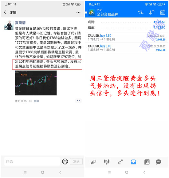 周三的交易,黛清明确的强调,黄金多,强势看多,不存在拐头现象。黄金美盘如约上涨。恭喜跟上交易的客户!