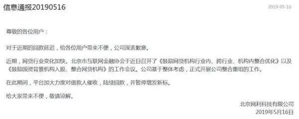 而就在警方侦查的前一日,5月16日,网利宝发布信息通报。通报显示,近期网贷行业变化加快。北京市互联网金融协会于近日召开了《鼓励网贷机构行业内、跨行业、机构内整合优化》以及《鼓励国资背景机构入股、整合网贷机构》的工作会议。公司基于整体考虑,正式开展公司整合重组的工作。在此期间,平台加大力度对借款人催收,陆续回款,并暂停增发新标。对于近期的回款延迟,给各位用户带来不便,公司深表歉意。