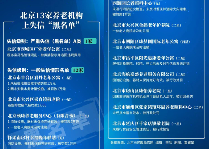 北京市民政局公布的首批2019年度北京市养老服务机构失信名单中,就有13家大小养老机构,因消防、取水、排放等违法违规被政府有关部门处罚、内设的定点医疗机构管理混乱、或者未及时在信息系统注销服务对象离院等信息,而“榜上有名”。