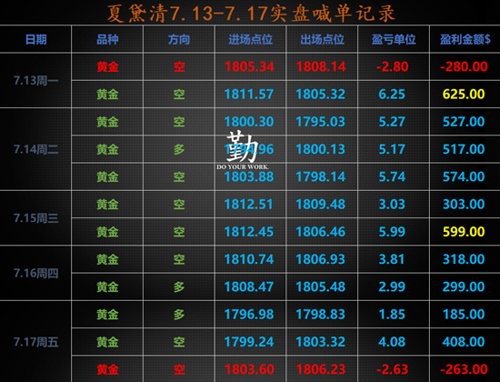 周一的交易出现小失误,黛清从亚盘便开始提醒,黄金承压看跌,第一单安排1805附近空,后冲高至1808一线止损。欧美盘黛清仍是坚持看空,所以冲高后继续进场空单。整体小盈利出局;