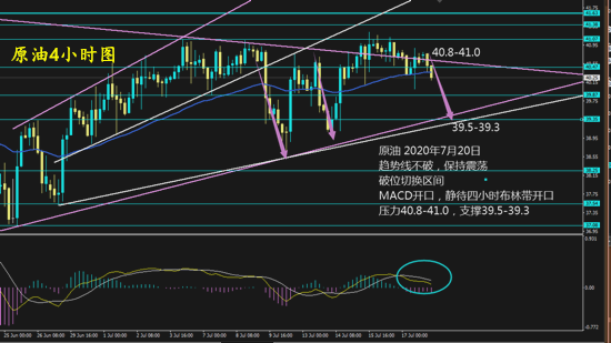 技术面上,在上周反弹确定趋势线阻力后开始震荡回落,整体仍是处于震荡区间范围内,两条趋势线位置没有突破之前,区间的切换范围比较小,随着时间的推移,上方的趋势线将不断上移,高点也将上移,下方的趋势也是上移,低点也将上移,现在的支撑位置叠加在39.5-39.3。