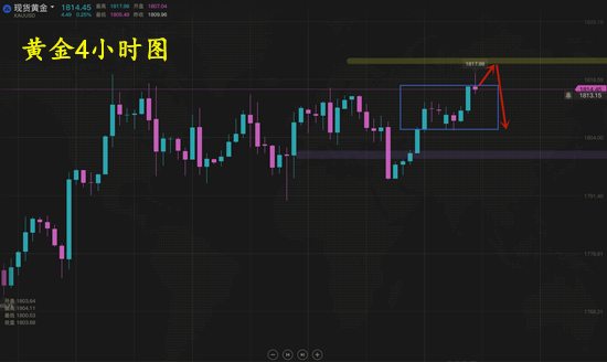 黄金4小时级别上依然是区间震荡整理走势,最近的行情涨跌看跌都非常强势,但是依然是处于区间内的震荡,多空都没有很好的延续性,一旦遇阻支撑或者压力,行情会立马转头,上周五行情强势上涨,今日多头反弹延续,但是没有突破1820前,黄金还不能轻言上涨,依然有再次回落区间的可能。