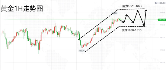 金价目前的价格向上缺乏明确的参考,只能跟进多头上行的动力和形态来确认多头能否延续,所以目前的价位也需要谨慎对待,此处不可轻举妄动,相信很多投资者都想做空了,但灵雁认为现在介入空单还太早,一方面小时图的多头形态依然还在,其次依托1803为低点的上升通道阻力也在1824位置和依托1798为低点的上升通道是同步的,所以1825区域才是我们需要关注的焦点!综合来看,黄金今日短线操作思路上个人建议以回调做多为主,反弹高空为辅,上方短期重点关注1823-1828一线阻力,下方短期重点关注1810-1805一线支撑。