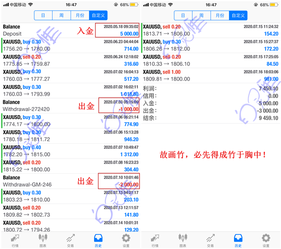客户入金5000美金,因之前投资亏损太多,加入灵雁实盘之前跟我讲,前期能否微仓交易,当然是可以的。你看过我的分析,但没有实盘跟上过我的操作,前期尝试性的跟单,是对自己的账户负责。目前客户已出金3000美金,账户纯盈利7000余美金!把交易当成一种表演,做好每一个细节,实盘交易不存在彩排!