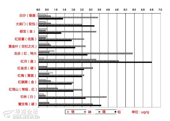 这份研究是美国和加拿大的研究人员联合做的。从05年开始,他们耗时三年检验了中国市场上几乎所有的常见香烟品牌,分析其物理特性、重金属含量等。有烟草专卖局的专家接受采访时回应称,香烟中的重金属含量是没有标准的,所以无法比较。其实不然,加拿大对香烟的检测非常严格,生产和进口厂家都需要检测并向卫生部报备关键数字,这次比较的正是加拿大的同期标准。在05/06年所检测的13个中国香烟品牌中,砷的平均含量为0.82μg/g(0.3~3.3),镉为3.21μg/g(2.0~5.4),铅为2.65μg/g(1.2~6.5),铬为0.55μg/g(0.0~1.0)。除了铬之外,其它三种重金属都严重超标。 在109种化学元素中,83种是金属,密度在5以上的金属统称为重金属。而铅、镉、砷这些重金属的危害都很大,一旦进入人体体内要想排出就是一个非常缓慢的过程。假如一天抽20支的香烟,那么大概平均一天下来身体会吸收3.2微克的镉,这点量不足以马上出现有害症状。…[详细] 但是假若每天都抽的话,就好比在人的身体之中慢慢地堆积毒素,久而久之,对身体的危害不言而喻。 重金属伴烟气进入体内,镉、铅被吸收的量最多 香烟的烟气中,重金属化合物以一种叫做气溶胶的形式存在,然后伴随着烟气进入体内。国内有学者进行过相关的研究,发现一支香烟的烟气中,最容易被吸收的重金属是镉,其次是铅,一支烟大概有46.4%的镉和26.4%的铅会进入肺部。(据《从吸烟前后香烟中微量元素含量的变化看吸烟的危害》 光谱学与光谱分析 2007.9)而按照镉含量最多的一个品牌的香烟来算,一克含5.4微克的镉,一包香烟的烟丝大概14克,那么抽一包烟就吸进去了35微克的镉。差不多三个月的时间,体内聚集的镉就足够有害了。 加工过程中引入重金属污染物 香烟在加工的过程当中也有可能会引入重金属污染物,比如在加工的过程中会使用香精、香料,并且还可能会有机械接触。另外,不同的加工工艺也会影响成品香烟中重金属的最终含量,研究表明不同产地、不同品牌的香烟中重金属的含量有一定差异:从香烟档次分析,低档香烟中所含重金属比高、中档高;从香烟烟型看,烤烟型比外香型重金属含量低。产生这些差异的原因,除了生产香烟的原料产地、环境、烟叶的质量和晾晒方式外,还可能与香烟的配方、生产工艺有关。