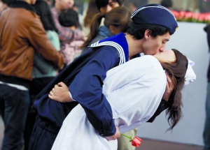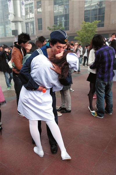 | 在世贸天阶,一对参与定格热吻活动的情侣摆出了“二战胜利之吻”的经典造型。京华时报 |