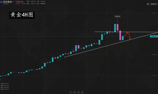 黄金午后大幅度下跌,冲高回落,黄金多头获利回吐,1980对于目前的行情来说就是一个坎。至于牛市是不是结束,我们暂时先不去讨论,针对当下的行情就是四个字,反弹先空。