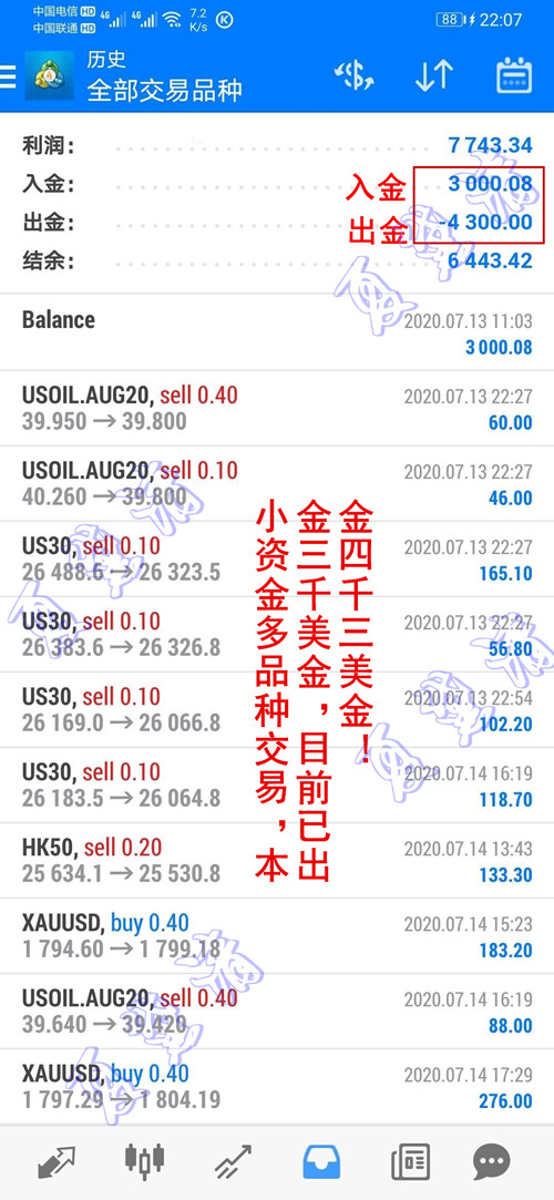 黛清这个学员入金3000美金,7月13号入金,并参与多个品种的交易,目前出金4300美金。黛清常说一句话,从帝国大厦的第一层走到顶楼,要一个小时。但是从楼顶纵身跳下,只需30秒,就可以回到楼底。不管资金是怎么样的一个水平,保证一份稳定长久的收益,把本金出掉,用盈利的部分继续交易,这才是规避风险的最好办法!