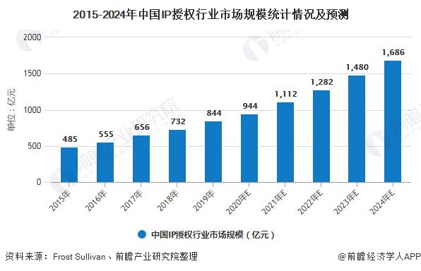 IP授权主要包括两类,商品授权及空间授权。商品授权是指IP拥有人通常在特定时期内允许被授权人凭借受欢迎的IP开发及销售商品产品的安排。空间授权指使用IP及相关概念进行主题活动或空间装饰(如展会、展览、主题店及主题公园)旨在提供沉浸式体验以及销售IP相关产品。根据弗若斯特沙利文数据显示,2019年中国IP授权市场规模达到844亿元,预计2024年市场规模将达到1686亿元。