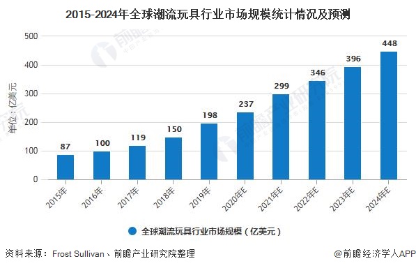 根据弗若斯特沙利文的数据显示,在可支配收入增加、潮流文化产业迅速发展,尤其是越来越多优质潮流玩具IP于市场成功孵化的驱动下,全球潮流玩具市场规模自2015年的87亿美元增长至2019年的198亿美元,年复合增长率为22.8%,预计2024年将达到448亿美元。