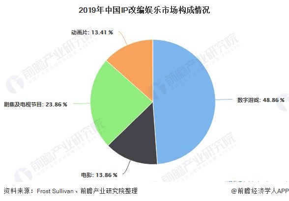 潮流玩具运营商可能授权其他公司在数字游戏、电影、剧集及电视节目及动画片中改编其IP以进行商业应用。按零售额计算,2019年中国IP改编娱乐市场规模达到3080亿元。其中,数字游戏改编市场规模为1505亿元,占据总规模的近一半比重;剧集及电视节目改编市场规模为73.5亿元,占总市场规模的比重为23.86%。