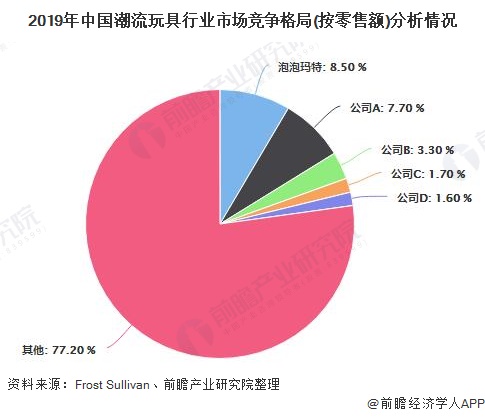2019年,中国潮流玩具市场按零售额计算,泡泡玛特市场份额排名第一,为8.5%,排在2-5位公司的市场份额分别为7.7%、3.3%、1.7%和1.6%。市场份额排在前五位的公司,除了泡泡玛特,其他都是专注于IP发掘及授权的主要跨国玩具制造公司。