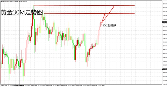 黄金目前突破1950一线,捅破阻力位,黄金趋势已经发生改变,回撤就是多,黄金1955一线直接多,回撤就是更好的进场多的机会,多头可以做起来了;