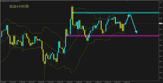 原油现在依然是日线上的震荡走势,本周是变盘节点,预计原油会打破当前的震荡区间,但是当前方向依然不明确,至于最终行情是选择上还是下突破,我们暂时关注41.5-43震荡区间的最终破位方向即可。在区间没有破位前,我们继续区间震荡操作即可。