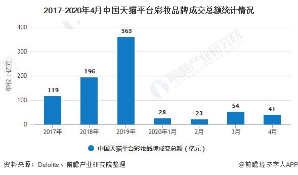 2017-2019年天猫平台彩妆品牌成交总额不断刷新纪录,并且增幅较大。2020年初受疫情影响,消费者由于长期居家对于彩妆的需求下降,2020年1月与2月彩妆销售额仅为28亿元和23亿元,同比下降18%和18%。随着疫情逐渐得到控制,消费者对于彩妆产品的需求回升,2020年3月和4月分别录得54亿元和41亿元,为2019年同期的近两倍。