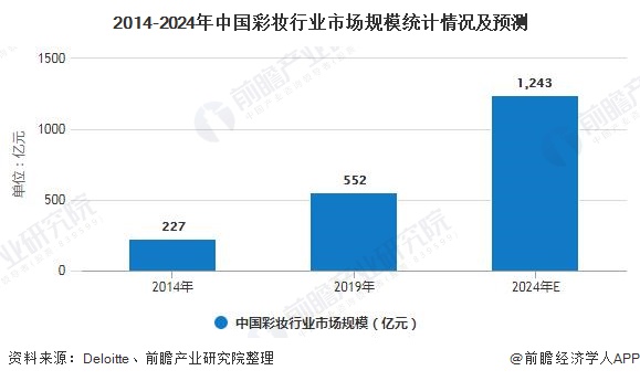 近年来,彩妆市场景气度逐渐提高,在消费者生活水平的提高,对美的追求逐渐强烈,彩妆市场中长期蓬勃发展的趋势将长期存在,据Deloitte数据,未来五年,我国彩妆市场仍将以17.6%的年复合增长率快速增长。2019年中国彩妆市场规模为552亿元,到2024年将达到1243亿元。