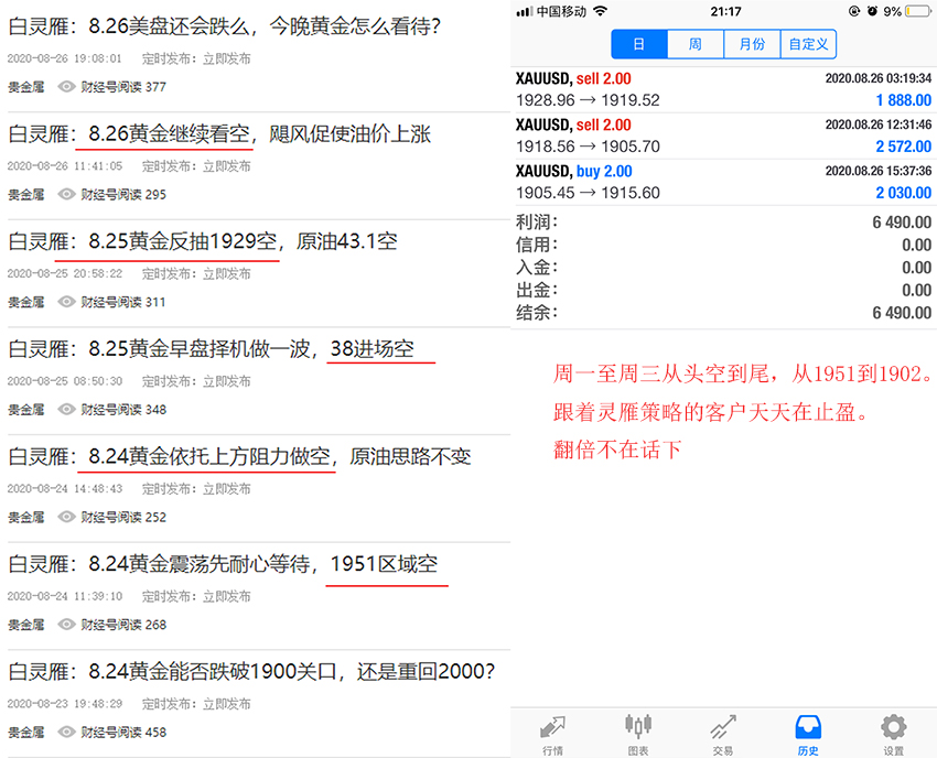 近几日的单子可以说是非常不错,灵雁一直秉持着黄金一定会跌下去的态度。果不其然周三最低跌倒1902。