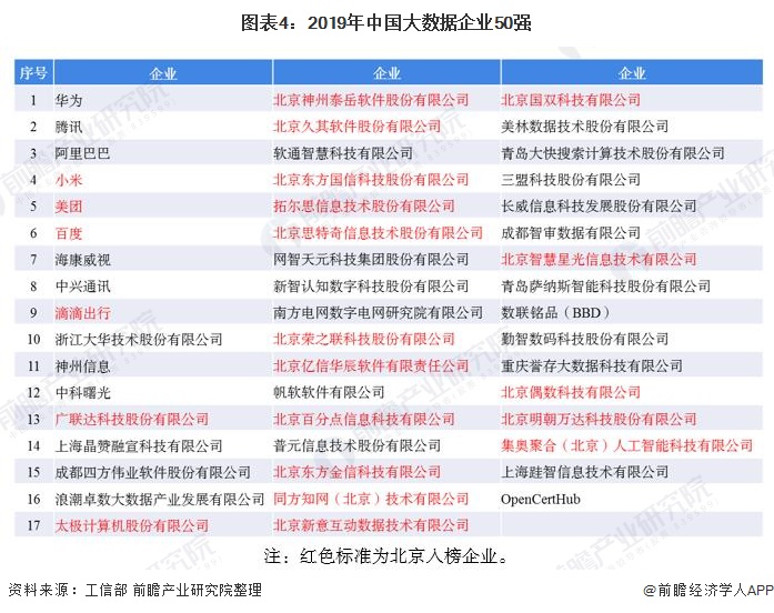 从发展意义来看,人工智能的核心在于数据支持,人工智能的实现需要通过从各种各样类型的海量数据中,快速获得有价值信息,为深度学习等人工智能算法提供坚实的素材基础。北京拥有大量具有竞争优势的大数据企业,在工信部公布的“2019中国大数据企业50强”榜单中,北京企业就占据了22家,全国排名第一。良好的大数据产业背景,为北京的人工智能的发展提供了重大支持。