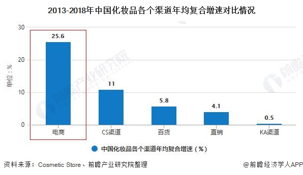 据统计,2013-2018年期间我国化妆品电商渠道年均复合增速高达25.60%,发展迅猛,远高于CS渠道、百货、直销及KA渠道。其中CS渠道年均复合增速为11.0%,百货渠道年均复合增速为5.80%,直销年均复合增速为4.10%,KA渠道年均复合增速为0.50%。