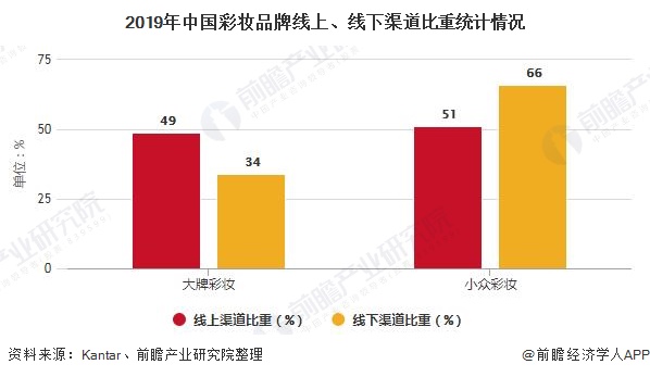 2019年受网购和社交新零售的发展,小众彩妆品牌在线上电商渠道快速发展。2019年我国小众彩妆品牌线上渠道比重达66%,远高于大牌彩妆线上渠道的34%。