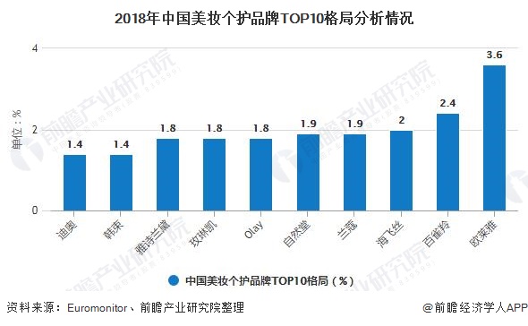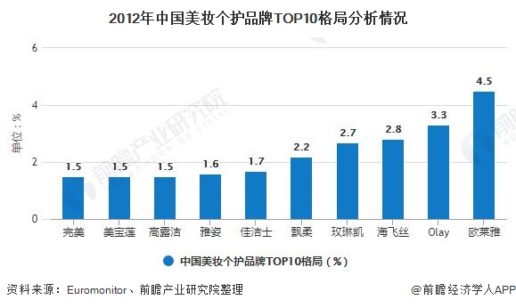 据统计,2012-2018年期间我国美妆个护品牌TOP10格局有所变化,2012年我国美妆个护品牌Cr10为23.3%,2018年Cr10为20%,较2012年品牌集中度有所降低。较2012年相比,2018年Top10品牌中的国产品牌数量及份额均有所增加。