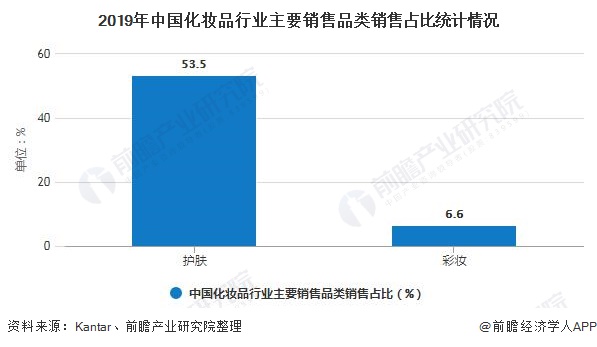 2019年我国化妆品行业主要销售品类为护肤类和彩妆类,其中护肤类销售占比达53.5%,彩妆类销售占比为6.6%。
