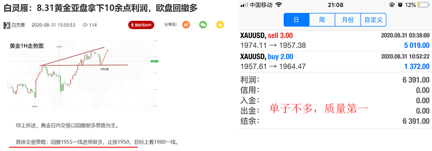 亚盘给出空单策略,欧盘给到1955多,加起来二三十个点的利润。