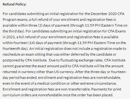 对于提交2020年12月CFA计划考试的初始注册的候选人,可在付款后的三(3)天内(至美国东部时间第三天晚上11:59)全额退还您的注册费和考试费。
