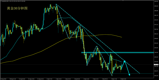 黄金下跌暂时在1920位置获得支撑,今日亚盘预计先反弹,上方关注1945和1950位置的压力,亚盘先多后空。