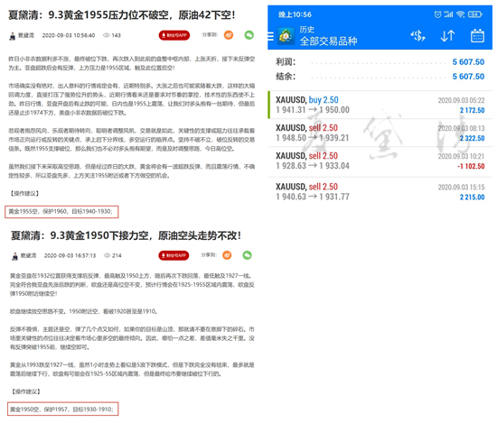 周四黄金整体是走空的趋势,早盘黄金先多后空,黛清实盘给出1941的多单,在1950盈利出局,获利2172.5美金,跟上的客户都会有一个小丰收,因为是早盘第一单,我们不过分去追多!1950附近给出现价空单,1939出局,获利2322.5美金。随后给出的1928空单没有延续亚盘的跌势,我们在1933位置及时止损出局,将亏损最小化处理。1940的空单在1931位置获利出局,挽回上一单的亏损。日内共交易四单,止损一单,共获利5607.5美金,转换人民币是三万八千三百四十一人民币。经过行情的起起落落,大家也认识了止损的重要性。