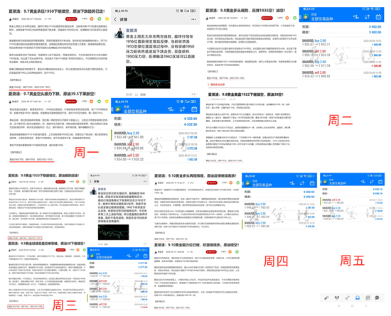 周五行情是多变的,但是黛清的思路依然是明确的,站稳1940我们就进场多单,黄金早盘延续周四凌晨的跌势,遇阻1950后继续回落,最低额触及1937一线后再次拉升。开盘时,黛清即刻通知学员进场空单,并且给出1940的止盈。止盈后1940多单进场,欧盘一直处于盘整震荡行情,美盘行情开始向上拉伸,黛清通知学员在1950出局多单。因为周五的行情多变。三单获利后就收场结束了!
