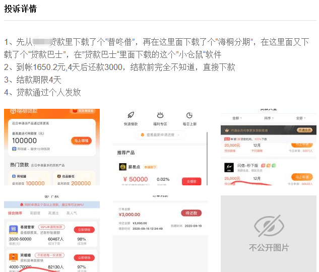 不仅如此,9月15日,网友在聚投诉发帖投诉,在某贷款平台下载“普咚借”,再在这里面下载了“海桐分期”,然后又在这里面下载了“贷款巴士”,最后通过贷款巴士下载了“小仓鼠”平台,在该品钛借款1650.2元你,4天后还款3000元,借款前不知情,直接下款,并通过个人放款,属于典型的“714高炮”。