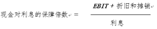 由于在计算EBIT的过程中,非现金项目折旧已经被减去,因而EBIT并不能真正度量可用于支付利息的现金有多少。由于利息多数情况下使对债权人的现金流出,所以可以定义一个现金对利息的保障倍数: