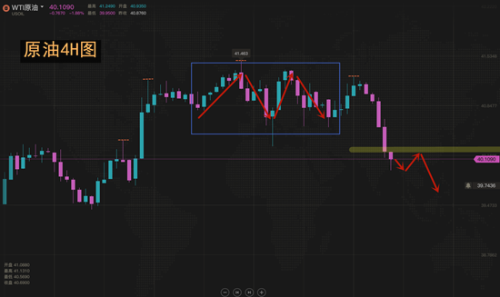 我们来看WTI原油走势,日线方面,原油突破布林带中轨后,便在中轨做震荡,在41.4测试顶部压力,后续收阴线,原油将回调至38-39附近
