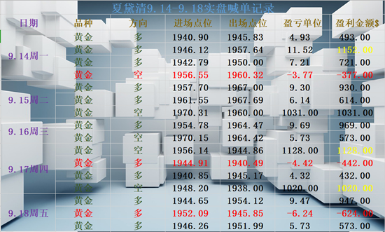 周四黄金亚盘延续昨日凌晨跌势,冲高后直接跌破1948支撑,方向转变。黛清顺势给到1956的空单,止盈位给到1944,止盈出局。欧盘窄幅震荡,是想看一波反弹的,黛清通知学员1945附近进场多单,但是行情震动后,延续跌势继续下行,这一单止损出局。1940再次通知学员短多进场,1945出局。美盘行情快速走低,黛清再次通知学员1948进场空单,给到止盈位1938,盈利十个点,坐收盈利即可。