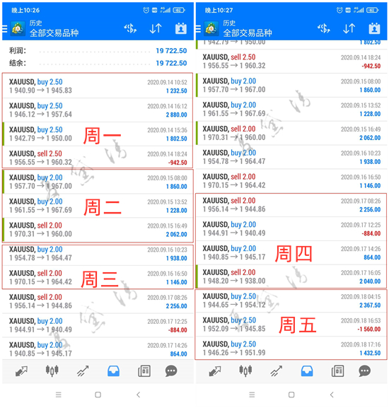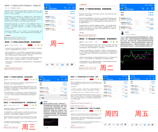 周五行情整体呈震动上涨走势,黄金开盘黛清即刻通知学员1944进场多单,1954出局,再次取得开盘首胜,盈利十个点。回调一波后黛清再次通知学员1952进场多单,欧盘行情在1956-1950徘徊,多单继续持有,美盘来临时,行情快速走低,黛清只能手动止损出局。但是这并没有改变黛清看多的思路,黄金回落1946继续进场多单,在1951盈利出局。周五行情变化较大。这一单出局后选择观望为主!祝大家周一交易愉快!