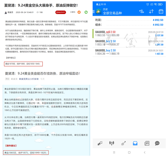 黄金接连四天连续下跌,顺应行情做跌的投资朋友一定是满载而归,周四黄金开盘小幅度回调后开始走空,黛清通知学员1863顺势现价进场空单。行情最低跌至1848位置。在1855位置通知学员空单盈利出局。欧盘行情开始回调修正,黛清通知学员1853进场多单,随后1854多单也再次通知进场。既然是看回调,盈利五个点出局即可。不追多。多单在1858、1860盈利出局。合理的把控仓位,利用支撑和阻力位下单,让每一单有理可依,有迹可循。严格止损,拒绝抗单。