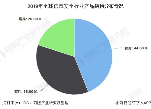 随着信息化程度的加深,网络的普及,全球都面临着愈演愈烈的网络攻击压力,重要数据、信息丢失造成的潜在风险愈来愈大,信息安全已成为保障国家政治、经济和社会稳定的重要力量。2019年,全球信息安全市场中,硬件、软件和服务的市场占有率分别为20%、36%和44%。