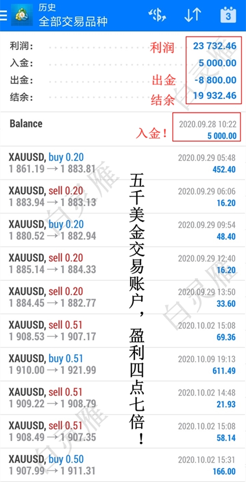 灵雁的学员跟着我交易,无非是信任我,认可我,可能前期失利了太多次,但是就是心有不甘,但是又充满恐惧。所以在交易初期,你可以轻仓甚至微仓交易,或者先看策略观察一段时期,绝了合适了,盈利率是你想要的,再按照正常仓位去做单。行情天天有,日日有,时时有,在可交易的时间段内把握几单行情不难。难的是想要每段利润都拿,每段行情都不错过。交易,实则是一场心态的考验。考的就是你贪心与否,不要过多的去追求完美的盈利,而是有一个稳健的盈利过程即可。不要追求只盈利不损单,哪怕错了也要扛回来,而要追求,错了及时止损,有舍才有得。交易看的不是一单两单,而是整体的过程,有失误不可怕,可怕的心态发生了变化!