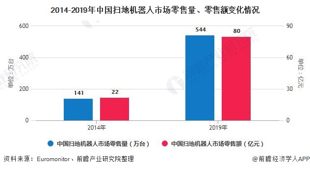 根据Euromonitor发布数据,2014年我国扫地机器人零售量和零售额分别为141万台和22亿元,2019年扫地机器人零售量和零售额分别达到544万台和80亿元。