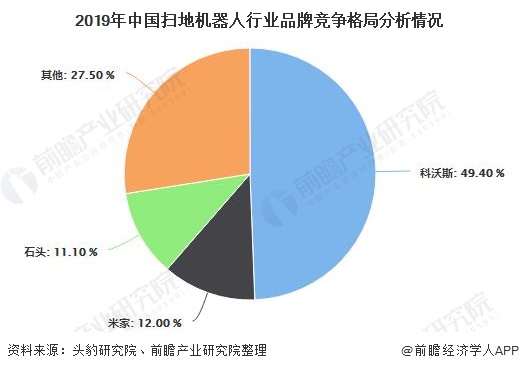 在产业竞争格局方面,目前中国扫地机器人行业集中度较高,2019年扫地机器人前三大品牌市场集中度达到72.5%。其中科沃斯是中国扫地机器人的龙头企业,2019年科沃斯扫地机器人市场占有率达到49.4%;其次是米家扫地机器人,市场占有率为12.0%;排在第三位的是石头扫地机器人,市场占有率为11.1%。