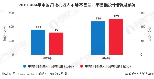 目前中国扫地机器人市场还处于发展的初期,当前普及率较低,行业仍有翻倍的空间。根据Euromonitor预测数据显示,2024年我国扫地机器人零售量和零售额分别将达724万台和129亿元,复合增速(2019-2024)分别达5.9%和10.0%。